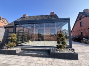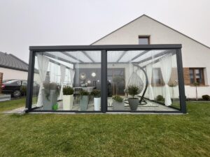 Zadaszenie 8 × 4 m w kolorze antracyt z systemem przesuwnym – nowoczesna, funkcjonalna przestrzeń, która zamienia taras w komfortowe miejsce do relaksu przez cały rok.