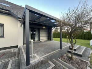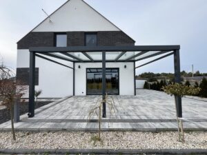 Zadaszenie 5 × 4 m z poliwęglanowym dachem łączy funkcjonalność i komfort – ochrona przed słońcem oraz przygotowanie do przyszłej zabudowy szklanej sprawiają, że taras staje się przestrzenią na każdą pogodę.