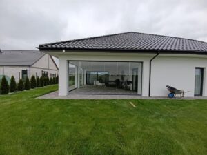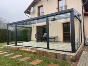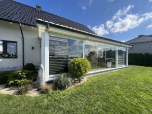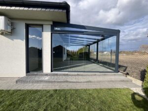 Elegancka i funkcjonalna zabudowa tarasu 4,8 × 3,6 m – solidna konstrukcja, szkło hartowane i przesuwne drzwi tworzą przestrzeń, w której design spotyka się z komfortem przez cały rok.