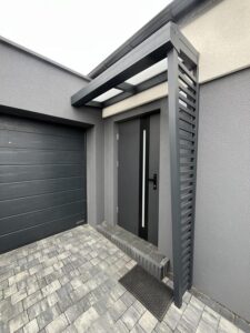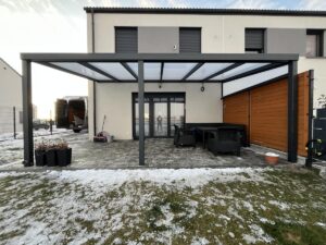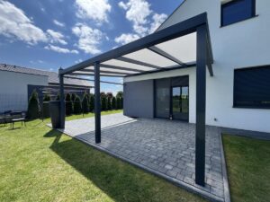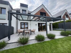 Jasne zadaszenie 4,2 × 3,5 m – lekka, elegancka konstrukcja z poliwęglanowym dachem, która zamienia taras w przytulne miejsce do relaksu o każdej porze dnia.